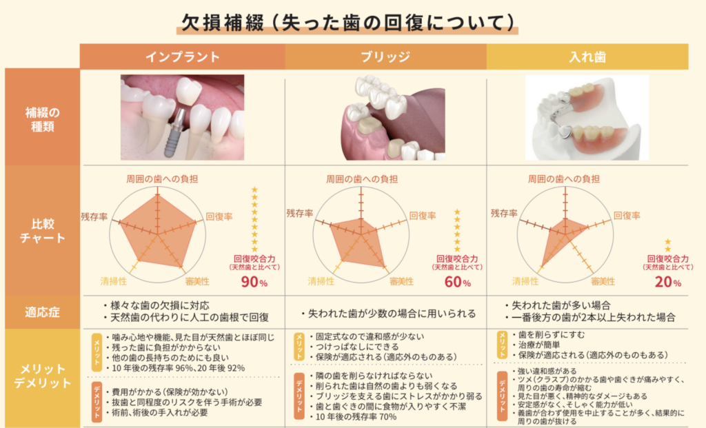 入れ歯やブリッジは、支えとなる周囲の歯に過度な負担をかけ、連鎖的に他の歯を失うリスクを高めます。一方、インプラントは独立した構造のため、残っている健康な歯の寿命を延ばす「予防的側面」が非常に強いのが特徴です。